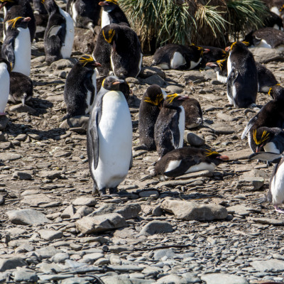 Saunders Island – Hier können wir den Schwarzbrauen-Albatros sehen und ihn bei seinen manchmal schwerfälligen Landungen beobachten. Er brütet zusammen mit Königskormoranen und Felsenpinguinen. Königs-, Magellan- und Eselspinguine sind hier ebenfalls zu finden.
