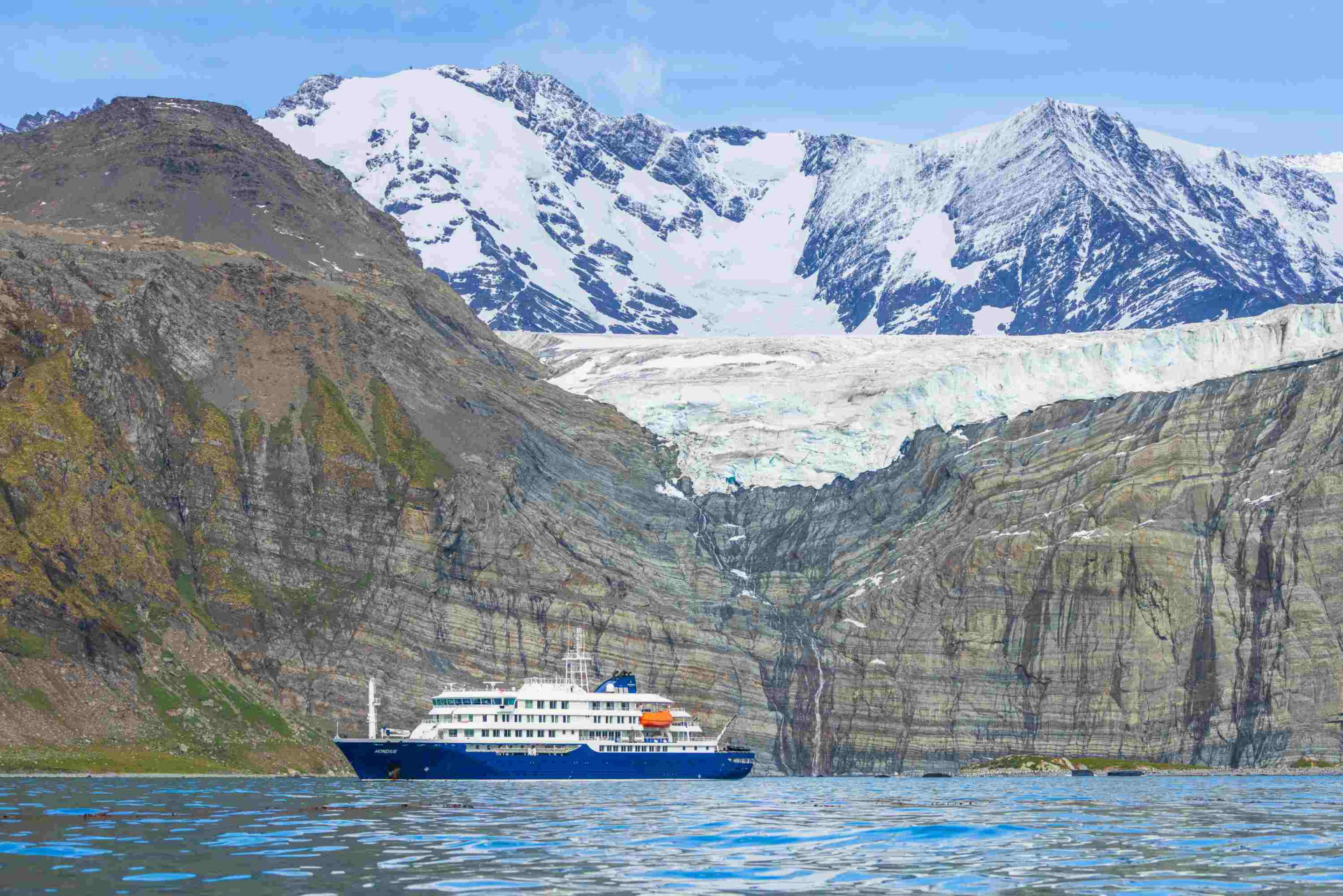 Fortuna Bay – In einer wunderschönen Überfluten vom Fortuna-Gletscher leben viele Königspinguine und Robben. Hier haben Sie die Möglichkeit, den letzten Abschnitt von Shackletons Weg zum verlassenen Walfängerdorf Stromness zu folgen. Diese Route führt über den Bergpass hinter Shackleton’s Waterfall. Das Gelände hier ist teilweise sumpfig, seien Sie also darauf vorbereitet auf dem Weg einige kleine Bäche zu überqueren.